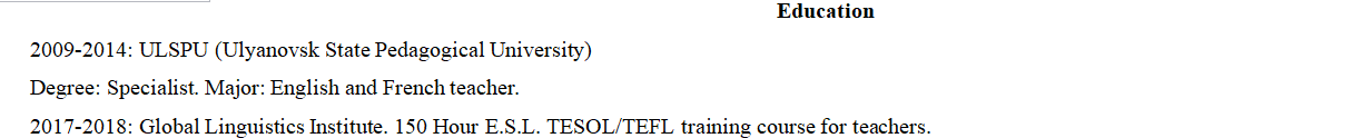 2009-2014年:ULSPU(烏利亞諾夫斯克州立教育大學(xué) 英語老師 2015年10月至2016年5月:我在有小孩的兒童教育中心“ Detvora”中擔(dān)任老師。 2013年至今:10至12歲兒童的英語和法語私人授課。 中國廣州 佛山培訓(xùn)中心英語老師 2017年2月至2017年7月:我曾在VG Kids幼兒園任教 |