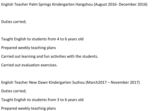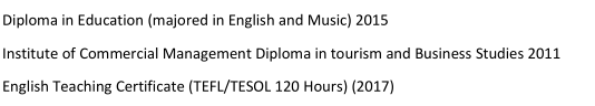 楓葉深圳2018年5月至2018年7月,楓葉鎮(zhèn)江9月至2018年10月 閱讀國際英語學(xué)校(山東省淄博市)的英語老師2019年6月至 2020年1月 專業(yè)資格 2015年教育文憑(英語和音樂專業(yè)) 英語教學(xué)證書(TEFL / TESOL 120小時(shí))(2017 |