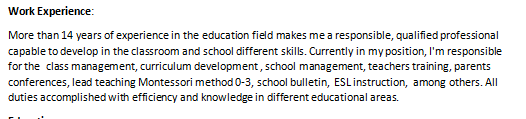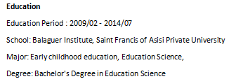 教育背景: 2009/2-2014/7: 早教專業(yè) 本科 教學經(jīng)驗: 在教育領域超過14年的經(jīng)驗使我成為一個負責任、合格的專業(yè)人才,能夠在課堂和學校中培養(yǎng)出不同的技能。目前在我的崗位上,主要負責班級管理、課程開發(fā)、學校管理、教師培訓、家長會議、主導教授蒙特梭利0-3法、學校簡報、ESL教學等。在不同的教育領域以高效率和知識完成所有任務。 |