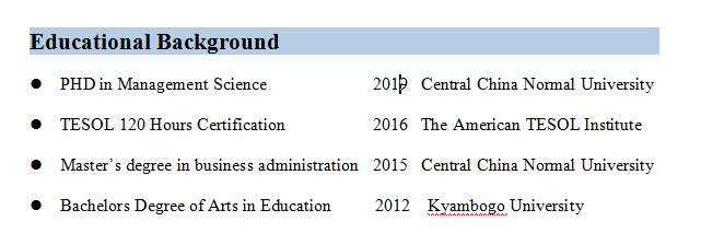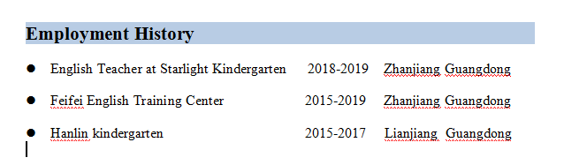 學(xué)歷 ?2019華中師范大學(xué)管理科學(xué)博士學(xué)位 ?2016年TESOL 120小時(shí)認(rèn)證美國TESOL研究所 ?2015年華中師范大學(xué)工商管理碩士學(xué)位 ?2012京都大學(xué)教育學(xué)士學(xué)位 工作經(jīng)歷 ?廣東省湛江市星光幼兒園英語老師2018-2019 ?飛飛英語培訓(xùn)中心2015-2019廣東省湛江市 ?廣東省連江市漢林幼兒園2015-2017 |