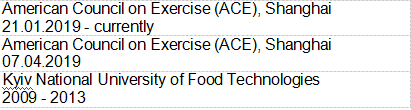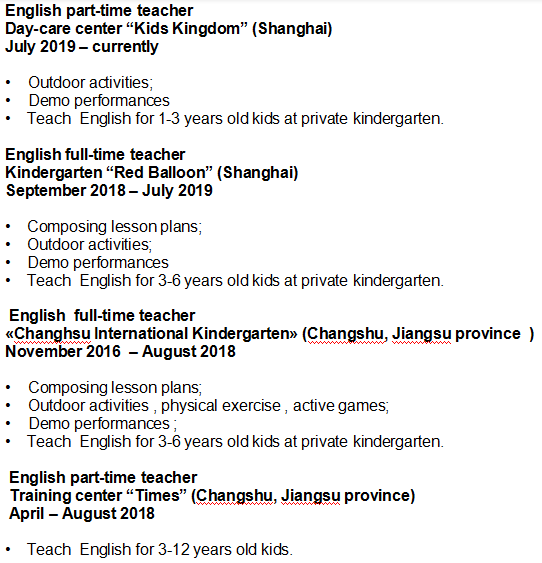 英文兼職老師 兒童中心日托中心(上海) 2019年7月–目前 英文專職老師 幼兒園“紅氣球”(上海) 2018年9月– 2019年7月 英文專職老師 ?常熟國際幼兒園?(江蘇省常熟) 2016年11月– 2018年8月 基輔國立食品科技大學2009-2013 |