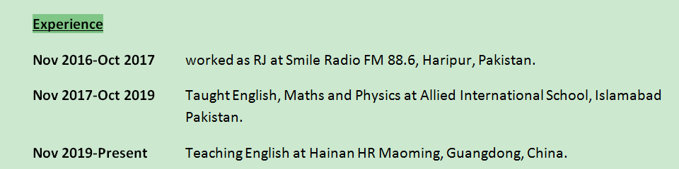 2016年11月- 2017年10月在巴基斯坦哈里普爾Smile Radio FM 88.6擔(dān)任RJ。 |