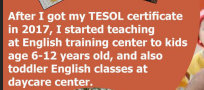 教育背景: TEFL 教學(xué)經(jīng)驗(yàn): 在培訓(xùn)學(xué)校 和早教做過(guò)英語(yǔ)老師 |