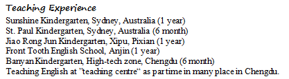 教育背景: 四川大學 博士學位 化學專業(yè) 教學經(jīng)驗: 陽光幼兒園 澳大利亞 1年 st Paul 幼兒園 澳大利亞 6個月 焦榮軍幼兒園 1年 英語學校 一年 板巖幼兒園 成都高新區(qū) 6個月 英語培訓學校 兼職 |