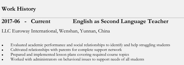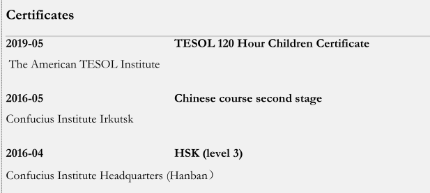 教育 2007-09-2012-06經(jīng)濟學(xué)學(xué)士:國際經(jīng)濟學(xué) 貝加爾國立經(jīng)濟法大學(xué) 2019-05 TESOL 120小時tesol 證書 美國TESOL研究所 2016-05語文課程第二階段 伊爾庫茨克孔子學(xué)院 2016-04年HSK(3級) 孔子學(xué)院總部(漢辦) 工作經(jīng)歷 2017-06-現(xiàn)任英語為第二語言老師 歐羅國際有限責(zé)任公司,云南文山 ?評估學(xué)業(yè)成績和社會關(guān)系,以發(fā)現(xiàn)并幫助陷入困境的學(xué)生 ?與父母建立良好的關(guān)系,建立完整的支持網(wǎng)絡(luò) ?制定并實施了涵蓋必修課程主題的課程計劃 ?與管理員合作解決行為問題,以支持所有學(xué)生的需求 |