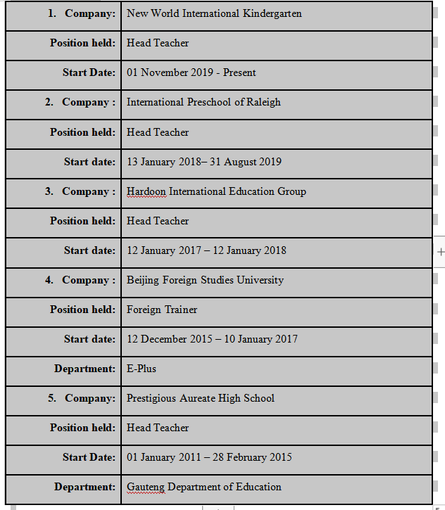 教育與資格 1.資格類型學位B.Ed. 學習領(lǐng)域教育 西北大學 工作經(jīng)驗 1.公司:新世界國際幼兒園 2.公司:羅利國際幼兒園 3.公司:哈頓國際教育集團 4.公司:北京外國語大學 擔任職務:外國培訓師 5,公司:著名的高中畢業(yè)生 擔任的職務:主任老師 |
