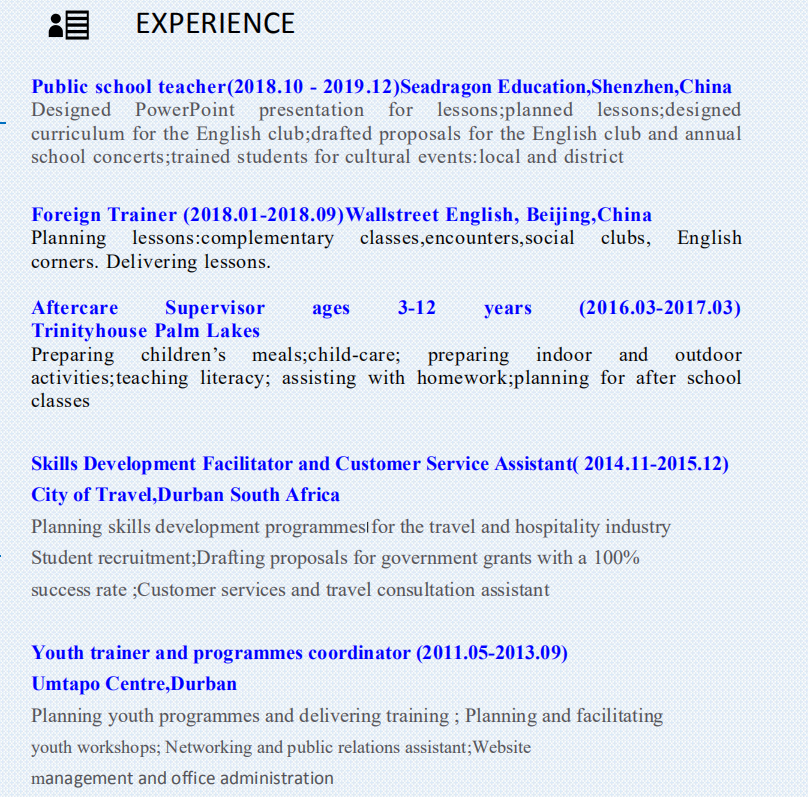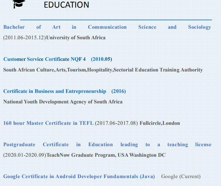 傳播科學(xué)和社會(huì)學(xué)文學(xué)學(xué)士學(xué)位(2011.06-2015.12)南非大學(xué) 160小時(shí)碩士證書在TEFL 公立學(xué)校老師(2018.10-2019.12)中國深圳海龍教育 外國培訓(xùn)師(2018.01-2018.09)華爾街英語,北京,中國 培訓(xùn)班 年齡3-12歲(2016.03-2017.03)Trinityhouse Palm Lakes 青年培訓(xùn)師(2011.05-2013.09)德班烏姆塔波中心 |
