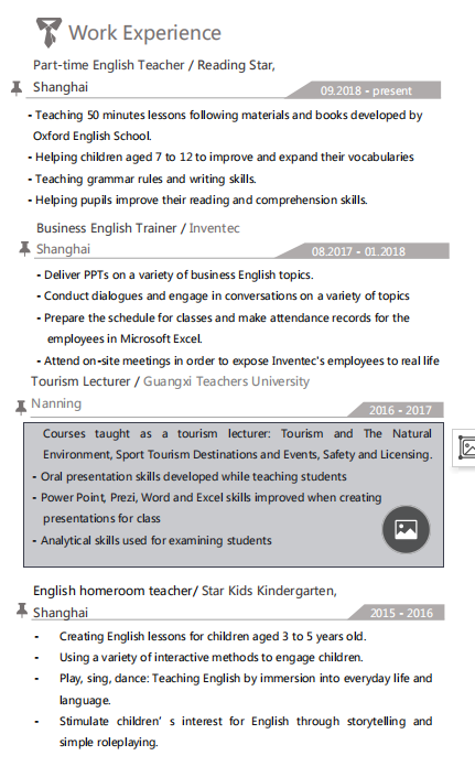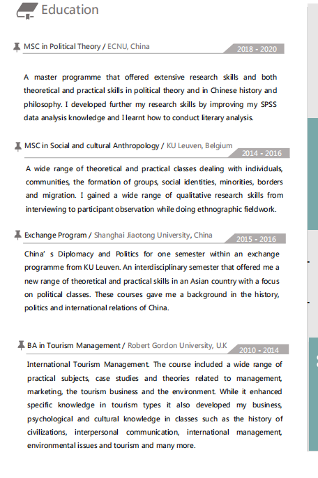 政治理論--中國 MSC社會文化人類學/比利時魯汶大學 交流項目/上海交通大學 英國羅伯特·戈登大學旅游管理學士學位 英語老師/讀書之星 商務英語培訓師/英業(yè)達 南寧英語教師 英語教師老師/星際兒童幼兒園 |