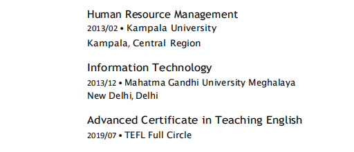 就讀于圣雄甘地大學(xué)信息技術(shù)專業(yè),坎帕拉大學(xué)人力資源管理專業(yè),有TEFL證書,在深圳有英語教師教學(xué)經(jīng)驗 |