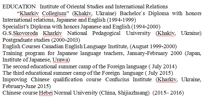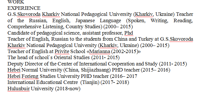 東方研究與國際關(guān)系教育學(xué)院“哈爾科夫?qū)W院”(烏克蘭,哈基夫)榮譽(yù)學(xué)士學(xué)位,國際關(guān)系,日語和英語(1994-1999年) 日語和英語專業(yè)文憑(1994-2000) G.S. Skovoroda Kharkiv國立教育大學(xué)(烏克蘭卡其夫)研究生課程(2000-2003) 加拿大英語語言學(xué)院英語課程,(1999年8月至2000年) 日語教師培訓(xùn)計(jì)劃,2000年1月至2月(日本浦和大學(xué)日語學(xué)院) 第二屆外語教育夏令營(2014年7月) 第三屆外語教育夏令營(2015年7月) 孔子學(xué)院(烏克蘭哈爾科夫,2015年2月至6月) 河北師范大學(xué)(中國石家莊)中文課程(2015–2016) 工作 經(jīng)驗(yàn) G.S. Skovoroda Kharkiv國立教育大學(xué)(烏克蘭哈爾科夫)俄語,英語,日語老師(口語,寫作,閱讀,綜合聽力,鄉(xiāng)村研究)(2000-2015年) 教育學(xué)候選人,助理教授,博士 G.S. Skovoroda Kharkiv國立教育大學(xué)(烏克蘭,哈爾科夫)的中國和土耳其學(xué)生的英語,俄語老師(2000-2015年) ?瑪里安娜(2002-2015)?私立學(xué)校英語老師 學(xué)校東方學(xué)系主任(2011-2015) 國際合作與研究中心副主任(2011-2015) 河北師范大學(xué)(中國石家莊)博士后(2015– 2016) 河北外國語大學(xué)PHD老師(2016– 2017 天津國際教育中心(2017-2018) 呼倫貝爾大學(xué)(2018年至今) |