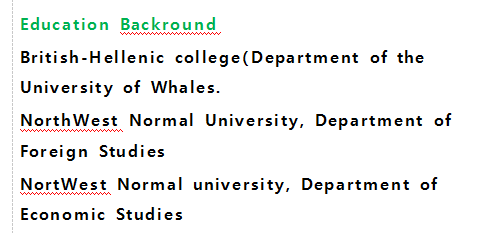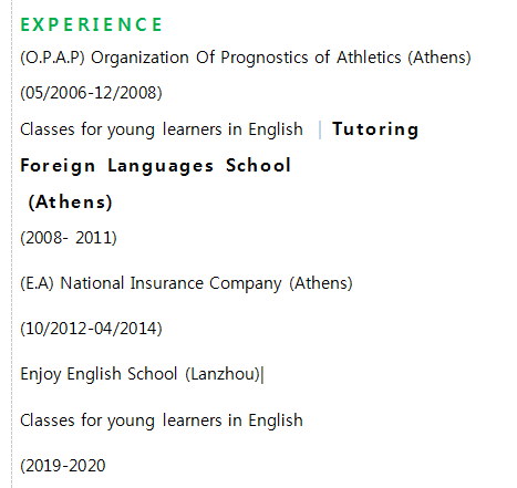 經驗 (O.P.A.P)田徑運動預測組織(雅典) (05 / 2006-12 / 2008) 青年英語班| 補習 外語學校(2008-2011年) 英語學校(蘭州)| 青年英語班 (2019-2020 教育背景 不列顛-希臘學院(鯨魚大學系。 西北師范大學外國語學院 西北西北師范大學經濟研究系 學習時間 BHC(09 / 2006-07 / 2009) 西北師范大學(09 / 2014-07 / 2015) NWNU(09 / 2015-07 / 2019) TEFL(04/2019) HSK3(05/2012) HSK4(05/2014) | |||