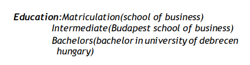 教育背景: 學歷:預科(商學院) 中級(布達佩斯商學院) 學士(德布勒森大學學士匈牙利) 教學經(jīng)驗: 兩年英語教學經(jīng)驗 |