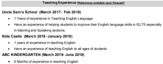 工作經(jīng)驗: 山姆大叔學(xué)校(2017年3月至2018年2月)·1年英語教學(xué)經(jīng)驗·有幫助學(xué)生提高雅思考試英語能力的經(jīng)驗 兒童城堡(2018年3月至2019年1月)·有1年英語教學(xué)經(jīng)驗·有向所有年齡段的學(xué)生教授英語的經(jīng)驗ABC KINDERGARTEN(2019年3月至2019年6月)·6個月的教學(xué)經(jīng)驗 英語教學(xué) 教育背景: 本科 計算機科學(xué)專業(yè) 旁遮普大學(xué) |