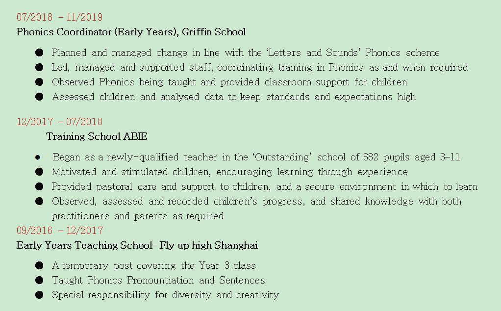 熱情。有效。激情。教師在幫助兒童進步、提供積極的學(xué)習(xí)經(jīng)驗以及建立和維持有效的行為管理系統(tǒng)方面有可靠的記錄。喜歡分享知識,激勵孩子和大人。有領(lǐng)導(dǎo)經(jīng)驗,善于培訓(xùn),激勵和發(fā)展他人。對有特殊需要的學(xué)生有廣泛的經(jīng)驗。 |