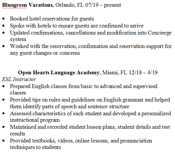 佛羅里達(dá)州奧蘭多中央佛羅里達(dá)大學(xué) 文科學(xué)士學(xué)位 佛羅里達(dá)州邁阿密,開放心語(yǔ)言學(xué)院12/18 – 4/19 ESL講師 韓國(guó)Ochang寶石語(yǔ)言學(xué)校5/18 – 11/18 母語(yǔ)英語(yǔ)老師 文藝復(fù)興憲章學(xué)校,佛羅里達(dá)州珊瑚泉6/17 – 04/18 K-8代課老師 |