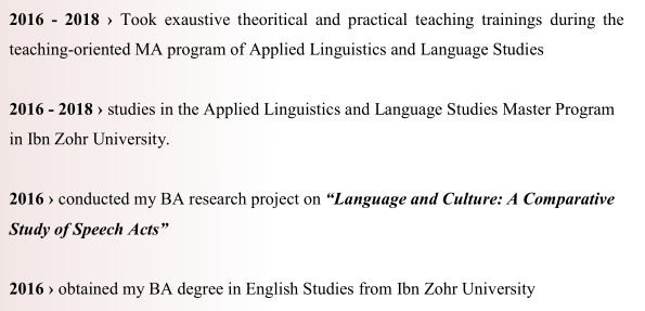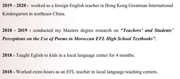 2019年– 2020年?在香港偉人國際學(xué)校擔(dān)任外語英語老師 東北地區(qū)的幼兒園 2018?在當(dāng)?shù)卣Z言中心向孩子授課了4個(gè)月的Eglish。 2018年?在當(dāng)?shù)卣Z言教學(xué)中心加班,擔(dān)任EFL老師 2018年-2019年??對(duì)“教師和學(xué)生”進(jìn)行了碩士學(xué)位研究 摩洛哥EFL高中教科書中使用詩歌的觀念” |