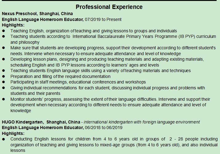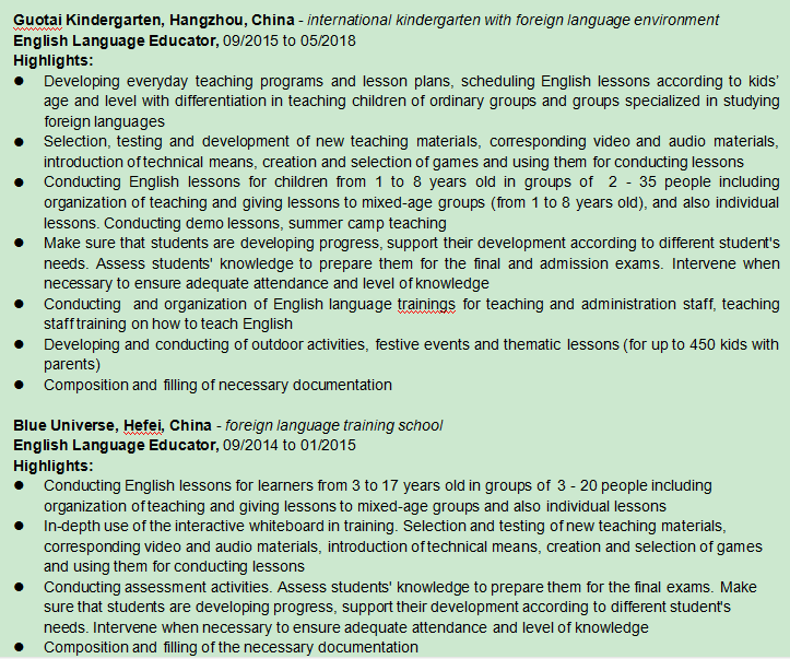烏克蘭卡拉辛·哈爾科夫國立大學(xué) 碩士學(xué)位,06/2015 專業(yè):英語、漢語 S.烏克蘭庫茲涅茨·哈爾科夫國立經(jīng)濟(jì)大學(xué) 學(xué)士學(xué)位,06/2014 專業(yè):金融 萊克斯幼兒園,中國上海 英語教師,2019年7月至今 亮點(diǎn): 教授英語,組織教學(xué),向團(tuán)體和個人授課 根據(jù)國際學(xué)士學(xué)位小學(xué)年計劃(PYP)的課程和理念對學(xué)生進(jìn)行教學(xué) 中國上海雨果幼兒園——帶外語環(huán)境的國際幼兒園 英語教師,2018年6月至2019年6月 亮點(diǎn): 以2 - 28人為一組,為4-6歲的兒童開設(shè)英語課程,包括組織教學(xué)和為不同年齡組(4-6歲)的兒童授課,以及個別課程 中國杭州國泰幼兒園——具有外語環(huán)境的國際幼兒園 英語教育工作者,2015年9月至2018年5月 亮點(diǎn): 制定日常教學(xué)計劃和教案,根據(jù)孩子的年齡和水平安排英語課程,區(qū)別對待普通群體和專門學(xué)習(xí)外語的群體的孩子 中國合肥藍(lán)天外語培訓(xùn)學(xué)校 英語教育工作者,2014年9月至2015年1月 亮點(diǎn): 以3 - 20人為一組,為3-17歲的學(xué)生開設(shè)英語課程,包括組織教學(xué)、為不同年齡組的學(xué)生授課以及個別課程 在培訓(xùn)中深入使用交互式白板。新教材的選擇和測試、相應(yīng)的視聽材料、技術(shù)手段的介紹、游戲的創(chuàng)作和選擇以及利用它們進(jìn)行教學(xué) |