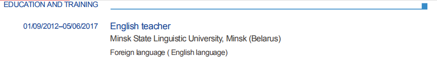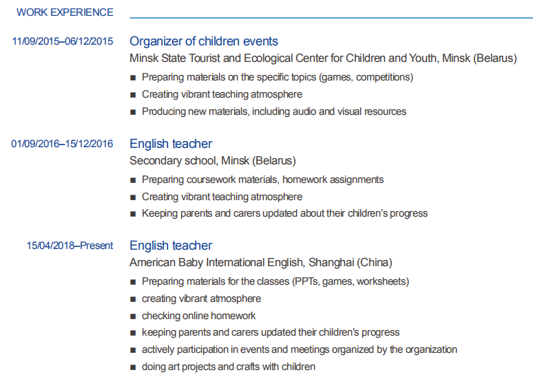 教學(xué)經(jīng)驗(yàn): 2015/11 / 09–2015 / 12/12兒童活動(dòng)的組織者 2016/01 / 09–2016 / 12/15英語老師 明斯克中學(xué)(白俄羅斯 15/04/2018 –目前的英語老師 美國嬰兒國際英語,上海(中國 教育背景: 01/09 / 2012–05 / 06/2017英語老師 明斯克國立語言大學(xué),明斯克(白俄羅斯) |