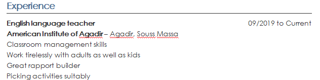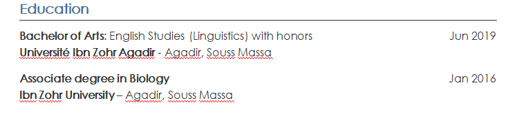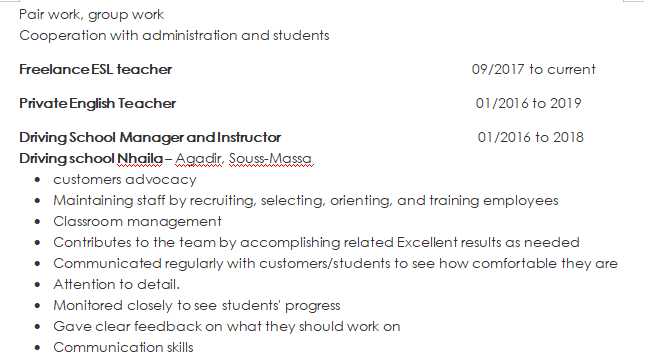 經(jīng)驗(yàn) 英語老師 阿加迪爾美國(guó)研究所 ESL老師 私人英語老師 教育 文學(xué)學(xué)士:英語研究 |