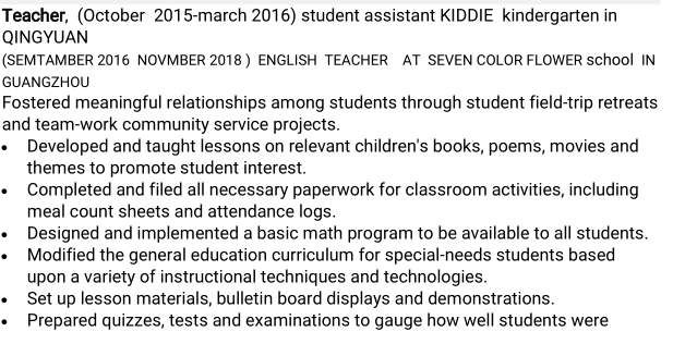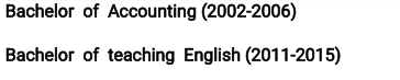老師(2015年10月至2016年3月) 清遠(yuǎn) (2016年11月9日,2018年11月)七色花學(xué)校的英語老師 廣州 會計(jì)學(xué)學(xué)士(2002--2006) 英語教學(xué)學(xué)士(2011--2015 |