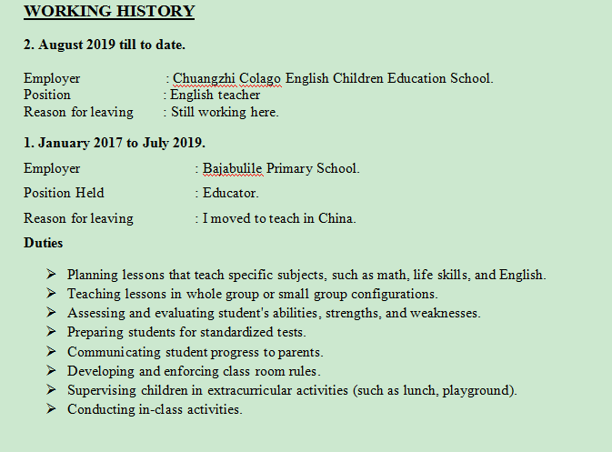 雇主:巴賈布里勒小學(xué)。 任職:教育家。 離開的原因:我搬到了中國(guó)教書。 |
