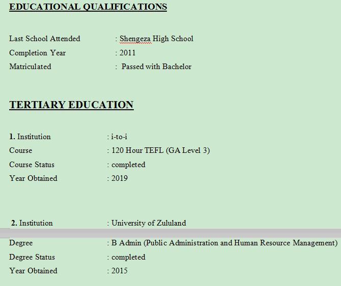 教育資格 最后就讀的學(xué)校:圣格薩高中 完成年份:2011年 錄取:通過(guò)學(xué)士學(xué)位 1.2019年8月至今。 雇主:創(chuàng)智可樂果英語(yǔ)兒童教育學(xué)校。 職位:英語(yǔ)老師 離職原因:仍在這里工作。