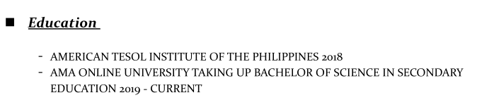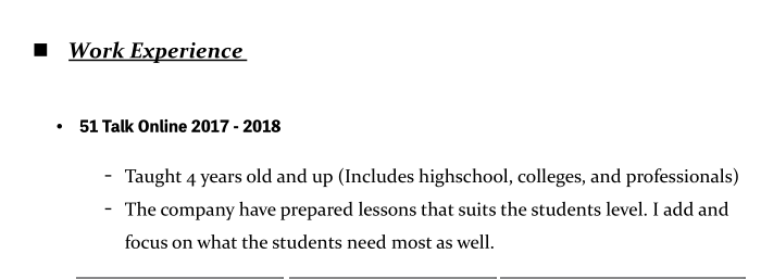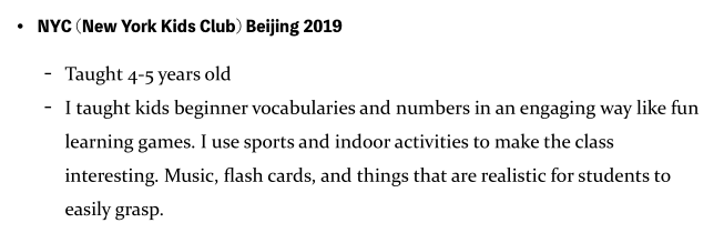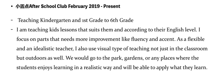 2018年美國TESOL菲律賓學(xué)院 -AMA在線大學(xué)獲得中學(xué)理學(xué)學(xué)士學(xué)位 教育2019-當(dāng)前 ?2017-2018 -年齡在4歲以上的老師(包括高中,大學(xué)和專業(yè)人士) -公司準(zhǔn)備了適合學(xué)生水平的課程。我添加和 重點(diǎn)關(guān)注學(xué)生最需要的東西。 (紐約兒童俱樂部)北京2019 -4-5歲 -我以有趣的方式教孩子們初學(xué)者的詞匯和數(shù)字學(xué)習(xí)游戲。我通過體育和室內(nèi)活動來上課有趣。音樂,抽認(rèn)卡和對學(xué)生逼真的東西 輕松掌握。 小圓點(diǎn)After School Club 2 019年2月至今 -幼兒園教學(xué)和一年級至六年級 -我正在根據(jù)孩子的英語水平教授適合他們的孩子課。專注于需要更多改進(jìn)的部分,例如流利度和口音。作為靈活和一個(gè)理想主義的老師,我不僅在教室里使用視覺教學(xué)但在戶外也是如此。我們會去公園,花園或任何地方學(xué)生喜歡以現(xiàn)實(shí)的方式學(xué)習(xí),并且能夠運(yùn)用所學(xué)知識. |