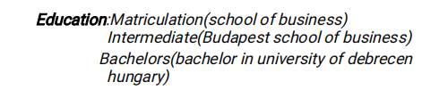 教學(xué)經(jīng)驗: 中國兩年教學(xué)經(jīng)驗 教育背景: 教育背景:大學(xué)預(yù)科課程 中級(布達佩斯商學(xué)院) 學(xué)士學(xué)位 匈牙利) |