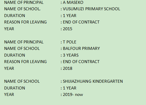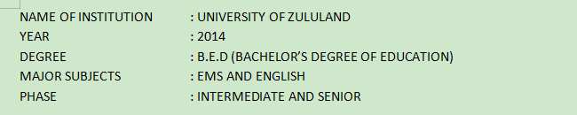 南非祖魯蘭大學英語教育專業(yè)畢業(yè),在南非有小學教學經(jīng)驗,在中國教幼兒園 |