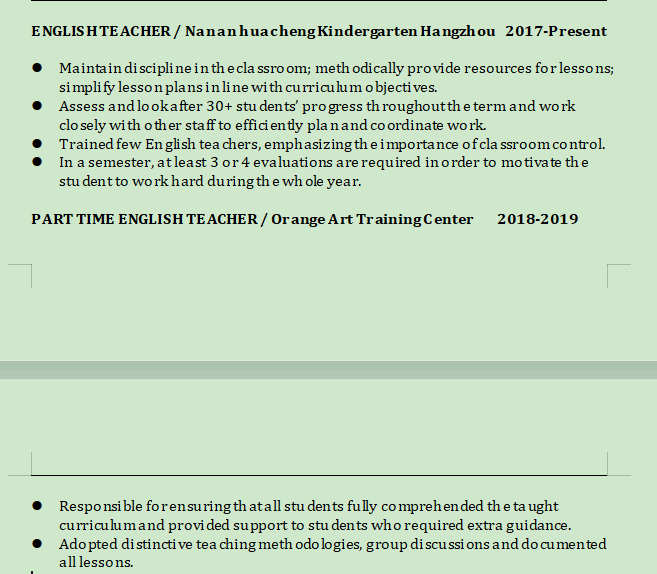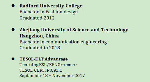 第一個(gè)本科在加納取得,時(shí)裝設(shè)計(jì)專業(yè),第二學(xué)位在中國取得,工程專業(yè),有TEFL證書,教學(xué)經(jīng)驗(yàn)2年左右 |