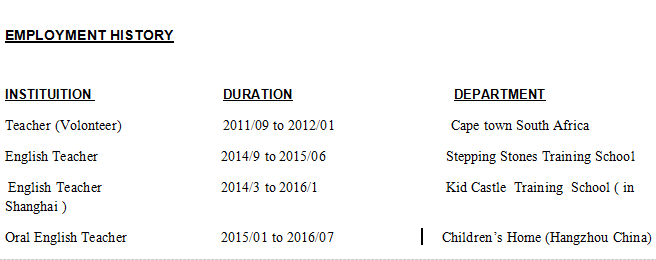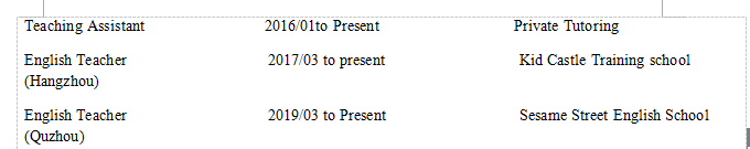 教學(xué)經(jīng)驗: 老師(Volonteer)2011/09至2012/01南非開普敦 英語老師2014/9至2015/06墊腳石培訓(xùn)學(xué)校 2014/3至2016/1英語老師城堡城堡培訓(xùn)學(xué)校(上海) 口語英語老師2015/01至2016/07兒童之家(中國杭州) 教學(xué)助理2016/01至現(xiàn)在私人輔導(dǎo) 2017/03年度英語教師至今,在城堡城堡培訓(xùn)學(xué)校(杭州) 英語老師2019/03至今芝麻街英語學(xué)校(Q州) 教育背景: 目前正在學(xué)習(xí)(計算機科學(xué)學(xué)士 |