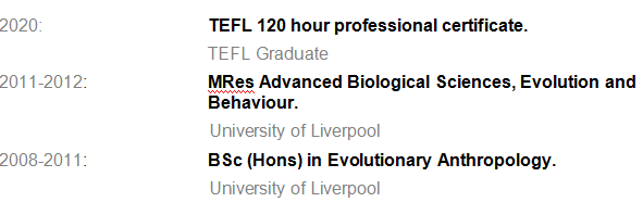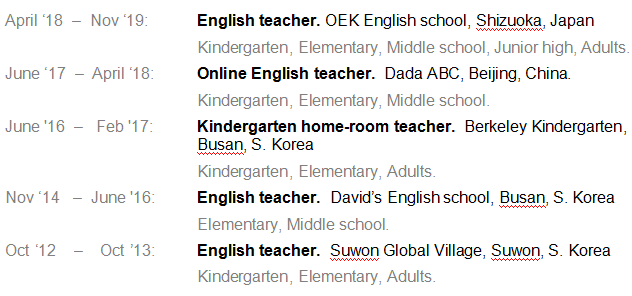 18年4月– 19日11月:英語老師。 OEK英語學(xué)校,靜岡,日本 幼兒園,小學(xué),初中,初中,成人。 17年6月– 18日4月:在線英語老師。 達達ABC,中國北京。 幼兒園,小學(xué),初中。 16年6月– 17年2月:幼兒園的班主任。 韓國釜山伯克利幼稚園 幼兒園,小學(xué),成人。 14年11月– 16年6月:英語老師。 大衛(wèi)的英語學(xué)校,韓國釜山 小學(xué),中學(xué)。 12月10日– 13年10月10日:英語老師。 韓國水原水原地球村 幼兒園,小學(xué),成人。 |