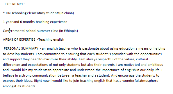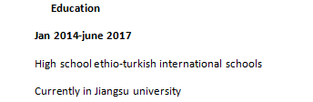 教學(xué)經(jīng)驗(yàn): *聯(lián)合國(guó)在校小學(xué)生(在中國(guó))1年6個(gè)月的教學(xué)經(jīng)驗(yàn) 公立學(xué)校暑期班(在埃塞俄比亞)專業(yè)領(lǐng)域-英語(yǔ)教學(xué) 教育背景: 教育 2014年1月至2017年6月 高中埃俄土耳其國(guó)際學(xué)校 現(xiàn)就讀于江蘇大學(xué) |