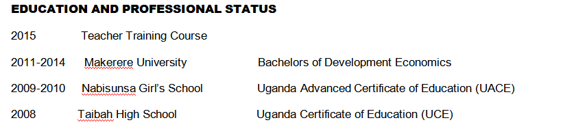 教育和專(zhuān)業(yè)地位 2015年教師培訓(xùn)課程 2011-2014麥克雷雷大學(xué)發(fā)展經(jīng)濟(jì)學(xué)學(xué)士 荊州經(jīng)院培訓(xùn)中心外語(yǔ)老師 甘肅捷通教育中心外語(yǔ)老師. 哈瓦中學(xué)文學(xué)老師 |