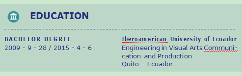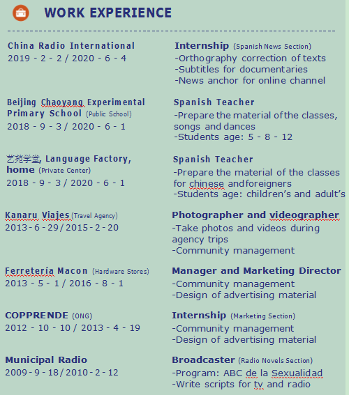學士學位 2009 - 9 - 28 / 2015 - 4 - 6 厄瓜多爾伊比利亞美洲大學視覺藝術(shù)交流與制作工程 厄瓜多爾基多 中國國際廣播電臺 2019 - 2 - 2 / 2020 - 6 - 4 北京朝陽實驗小學(公立學校) 2018 - 9 - 3 / 2020 - 6 - 1 藝苑學堂,語言工廠,家庭(私人中心) 2018 - 9 - 3 / 2020 - 6 - 1 Kanaru Viajes(旅行社) 2013 - 6 - 29 / 2015 - 2 - 20 費雷娜·梅肯(五金店) 2013 - 5 - 1 / 2016 - 8 - 1 科普蘭德(ONG) 2012 - 10 - 10 / 2013 - 4 - 19 市政電臺 2009 - 9 - 18 / 2010 - 2 - 12 頂級技能 實習(西班牙語新聞部) -文本的拼寫糾正 紀錄片的字幕 -在線頻道的新聞主播 西班牙語教師 -準備課程、歌曲和舞蹈的材料 -學生年齡:5 - 8 - 12歲 西班牙語教師 -為中國人和外國人準備課程材料 -學生年齡:兒童和成人 攝影師和攝像師 -在旅行社旅行期間拍攝照片和視頻 -社區(qū)管理 經(jīng)理兼營銷總監(jiān) -社區(qū)管理 -廣告材料的設(shè)計 實習(市場部) -社區(qū)管理 -廣告材料的設(shè)計 廣播員(廣播小說組) -節(jié)目:性感廣播 -為電視和廣播寫劇本 |