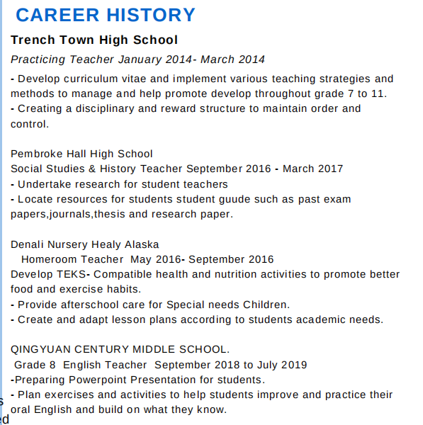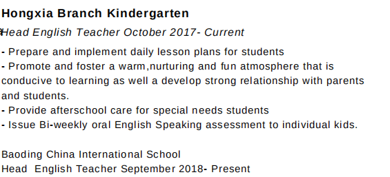 教學(xué)經(jīng)驗(yàn): 2014年1月至2014年3月(Trench Town高中)實(shí)習(xí)老師 彭布羅克大廳高中社會(huì)研究與歷史老師2016年9月至3月20日 Denali托兒所Healy阿拉斯加班主任教師2016年5月至9月20日 慶元世紀(jì)中學(xué)8年級(jí)英語(yǔ)老師2018年9月至7月20日 紅霞分校幼兒園首席英語(yǔ)老師2017年10月至今 保定中國(guó)國(guó)際學(xué)校校長(zhǎng)英語(yǔ)老師2018年9月至今 教學(xué)背景: 本科:歷史文化與社會(huì)學(xué)專業(yè) TEFL |