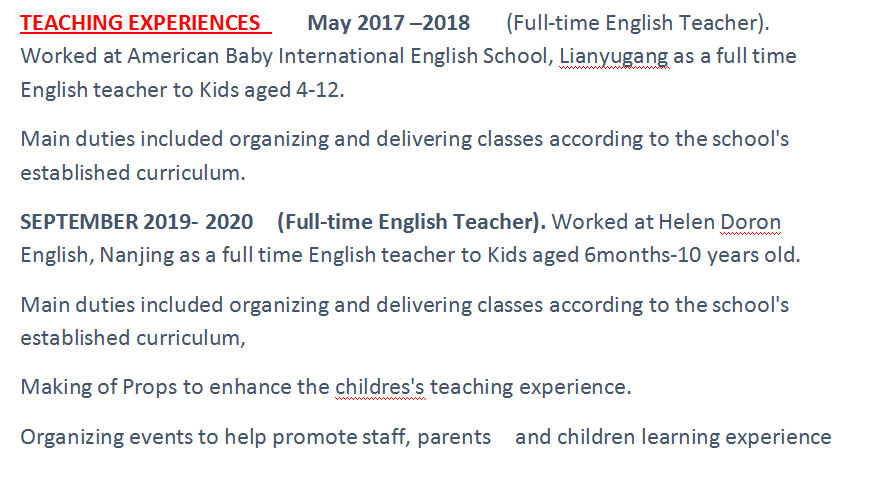 學(xué)術(shù)背景 2012年8月-2016年7月西倫敦大學(xué) 商業(yè)經(jīng)濟(jì)學(xué)理學(xué)學(xué)士學(xué)位,二等榮譽(yù) 2019年7月Tesol證書(shū)120小時(shí) 教學(xué)經(jīng)驗(yàn)2017年5月– 2018年(專(zhuān)職英語(yǔ)老師)。 在連玉港市美國(guó)嬰兒國(guó)際英語(yǔ)學(xué)校任職,專(zhuān)職為4-12歲兒童提供英語(yǔ)教學(xué)。 主要職責(zé)包括根據(jù)學(xué)校既定課程組織和授課。 2019年9月-2020年(專(zhuān)職英語(yǔ)老師)。 在南京海倫·多倫英語(yǔ)學(xué)校工作,擔(dān)任6個(gè)月至10歲兒童的專(zhuān)職英語(yǔ)老師。 主要職責(zé)包括根據(jù)學(xué)校的既定課程組織和授課, 制作道具以增強(qiáng)孩子的教學(xué)經(jīng)驗(yàn)。 舉辦活動(dòng)以促進(jìn)員工,父母和孩子的學(xué)習(xí)經(jīng)歷 |