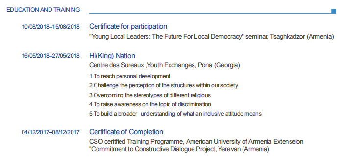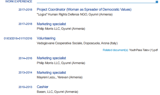教學經驗: 2017–2018項目協(xié)調員(婦女,傳播民主價值觀)“標志”人權捍衛(wèi)非政府組織,久姆里(亞美尼亞) 2017–2018市場營銷專家(亞美尼亞) 3 / 2016–01 / 11/2016志愿服務阿羅納(意大利) 2014–2016年營銷專家(亞美尼亞) 2013–2014年營銷專家埃里溫(亞美尼亞) 教育背景: 10/08 / 2018–15 / 08/2018參加證書 青年地方領導人:地方民主的未來”研討會, 16/05 / 2018–27 / 05/2018蘇納中心,青年交流,波那(喬治亞州)亞美尼亞 |