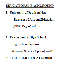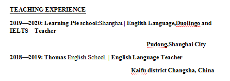 教學(xué)經(jīng)驗: 2019年至2020年:學(xué)習(xí)派學(xué)校:上海。 英語老師,Duolingo和雅思老師上海市浦東 2018年至2019年:托馬斯英語學(xué)校。 | 英語老師 中國長沙開福區(qū) 教育背景: 1.南非大學(xué) 藝術(shù)與教育學(xué)士 (MBBS學(xué)位)--- 2015年
