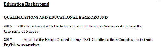教學(xué)經(jīng)驗(yàn): 2018年2月– 2020年1月 在中國蘇州的一所國際雙語學(xué)校擔(dān)任英語老師。 教學(xué)背景: 2015年— 2017年畢業(yè)于內(nèi)羅畢大學(xué),獲得工商管理學(xué)士學(xué)位 2017年,我參加了英國文化協(xié)會頒發(fā)的來自加拿大的TEFL證書,以便向非本地人教授英語。 |