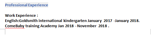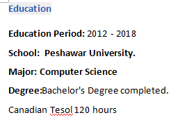 教學(xué)經(jīng)驗(yàn): 英語:戈德史密斯國際幼兒園2017年1月至2018年1月。 ComeBaby培訓(xùn)學(xué)院2018年1月-2018年11月 教育背景: 學(xué)制:2012-2018 學(xué)校:白沙瓦大學(xué)。 專業(yè):計算機(jī)科學(xué) 學(xué)位:學(xué)士學(xué)位。 加拿大Tesol 120小時 |