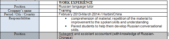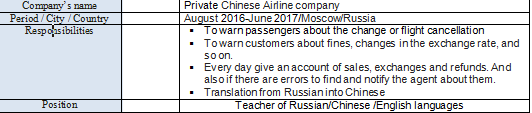 教學(xué)經(jīng)驗(yàn): 2013/2-2014/3: 哈爾濱 俄語家教 2016/8-207/6:俄羅斯 英語/俄語/漢語老師 |