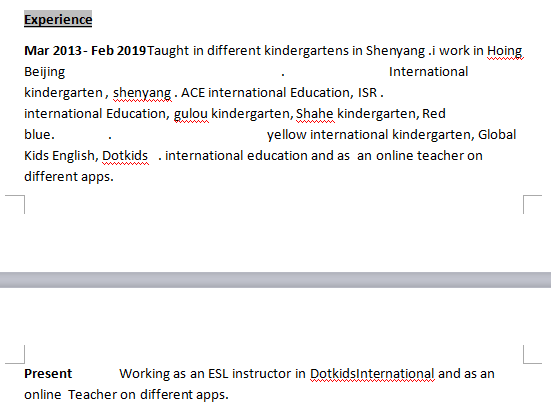 教學(xué)經(jīng)驗(yàn): 2013年3月至2019年2月在沉陽(yáng)不同的幼兒園教書。 沉陽(yáng)國(guó)際幼兒園。 ACE國(guó)際教育,ISR。 國(guó)際教育,鼓樓幼兒園,沙河幼兒園,紅藍(lán)。 。 黃色國(guó)際幼兒園,全球兒童英語(yǔ),Dotkids。 國(guó)際教育,并作為在線老師使用不同的應(yīng)用程序。 目前在DotkidsInternational擔(dān)任ESL講師,并在其他應(yīng)用程序上擔(dān)任在線老師。 教學(xué)背景: 2012-2014中級(jí) 2015-2019本科 |