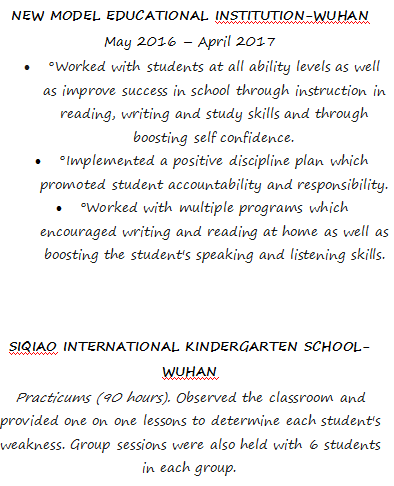 新型教育機(jī)構(gòu)-武漢 2016年5月– 2017年4月 四橋國際幼兒園-武漢 經(jīng)濟(jì)學(xué)學(xué)士學(xué)位-2015-2019 武漢大學(xué) |