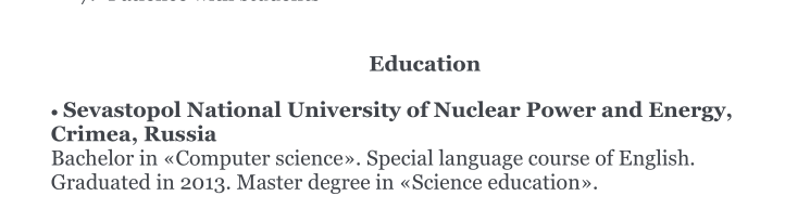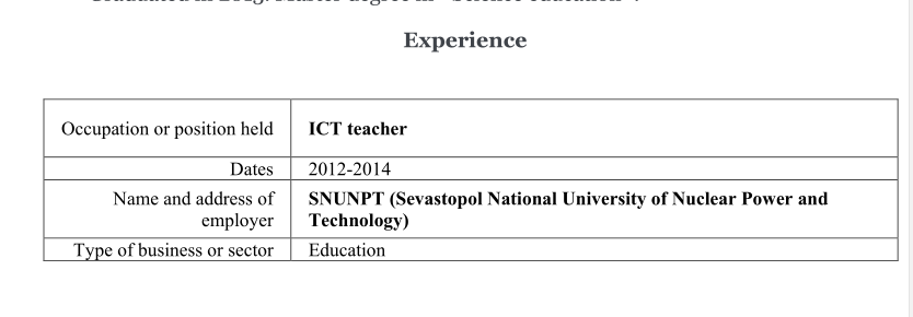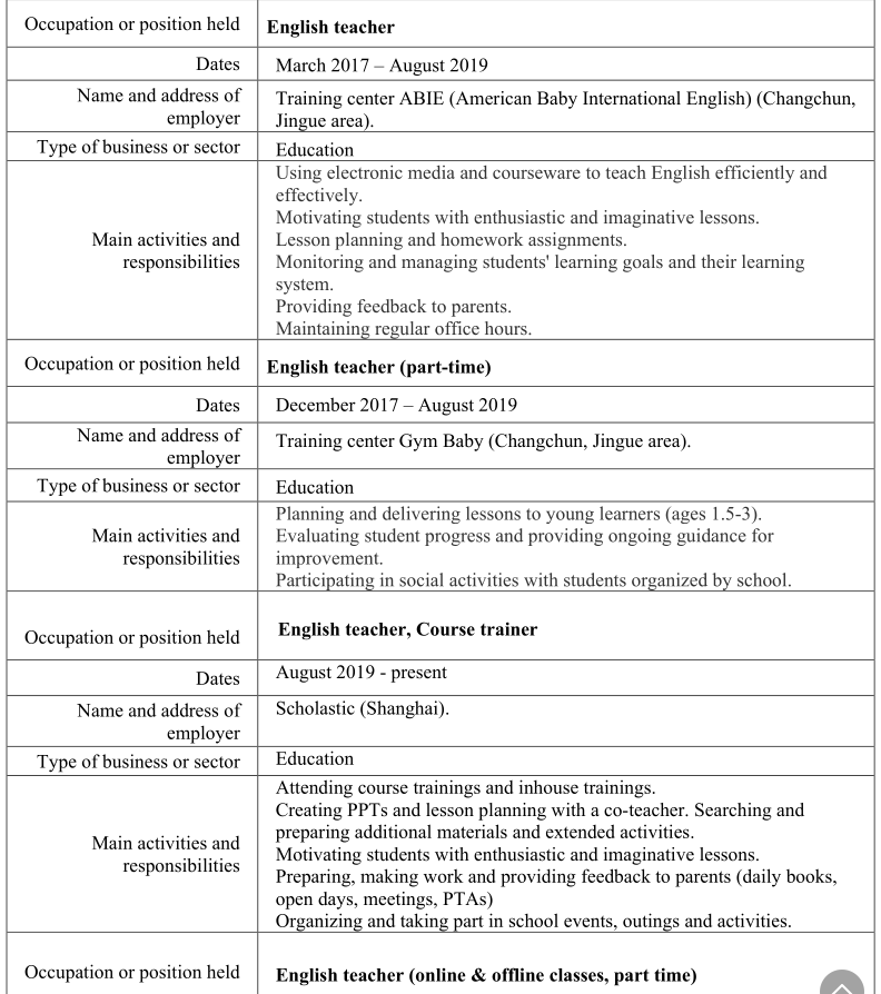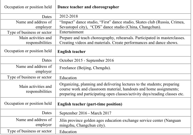職業(yè)或職位 英語(yǔ)老師 日期2017年3月– 2019年8月 培訓(xùn)中心ABIE(美國(guó)國(guó)際嬰兒英語(yǔ))(長(zhǎng)春)。 職業(yè)或職位 英語(yǔ)老師(兼職) 日期2017年12月– 2019年8月 嬰兒健身訓(xùn)練中心(長(zhǎng)春)。 業(yè)務(wù)或部門類型教育 職業(yè)或職位 英語(yǔ)老師,課程培訓(xùn)師 2019年8月至今上海)。 企業(yè)或機(jī)構(gòu)的類型 職業(yè)或職位 英語(yǔ)老師(在線和離線課,兼職) 職業(yè)或職位舞蹈老師和編舞 日期2012-2018 的名稱和地址 雇主 “ Impact”舞蹈工作室,“ First”舞蹈工作室,冰鞋俱樂(lè)部(俄羅斯,克里米亞, 塞瓦斯托波爾市),“ CDS”舞蹈工作室(中國(guó),長(zhǎng)春)。 業(yè)務(wù)或部門類型娛樂(lè) 職業(yè)或職位 英語(yǔ)老師 日期2015年10月-2016年9月 的名稱和地址 雇主 自由職業(yè)者(北京,成都)。 企業(yè)或機(jī)構(gòu)的類型 職業(yè)或職位 英語(yǔ)老師(兼職) 日期2016年9月-2017年3月 雇主 吉林省黃金時(shí)代教育交流服務(wù)中心(南關(guān) 長(zhǎng)春市明珠)。 企業(yè)或機(jī)構(gòu)的類型 教育 教育 ?塞瓦斯托波爾國(guó)立核電和能源大學(xué), 俄羅斯克里米亞 ?計(jì)算機(jī)科學(xué)?學(xué)士學(xué)位。 英語(yǔ)語(yǔ)言課程。 2013年畢業(yè)?!犊茖W(xué)教育》碩士學(xué)位 |