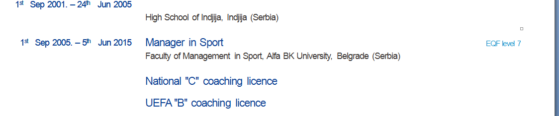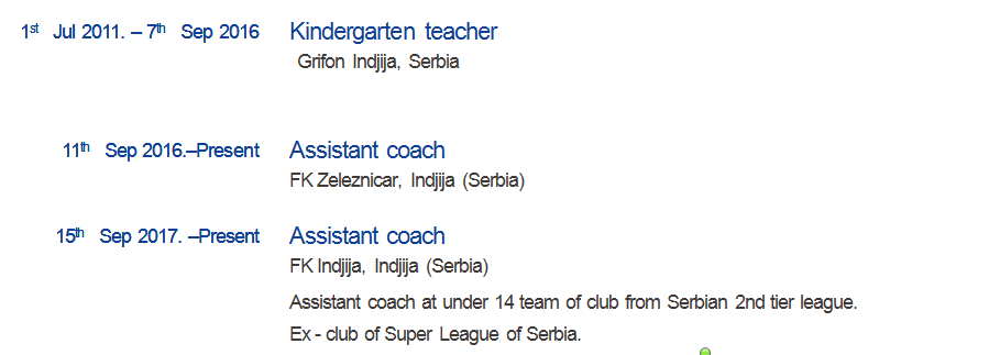2011年7月1日。——2016年9月7日幼兒園教師 Grifon Indjija,塞爾維亞 2016年9月11日。現在的助理教練 FK Zeleznicar, Indjija(塞爾維亞) 2017年9月15日。現在的助理教練 FK Indjija, Indjija(塞爾維亞) 塞爾維亞二級聯賽14歲以下俱樂部助理教練。 前塞爾維亞超級聯賽俱樂部。 |