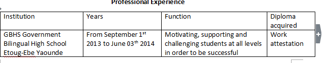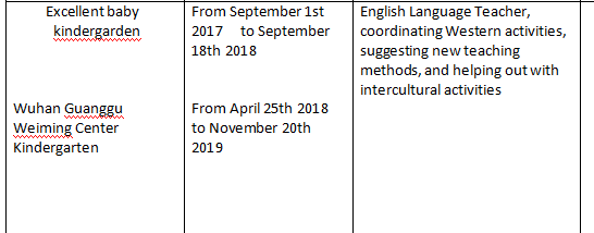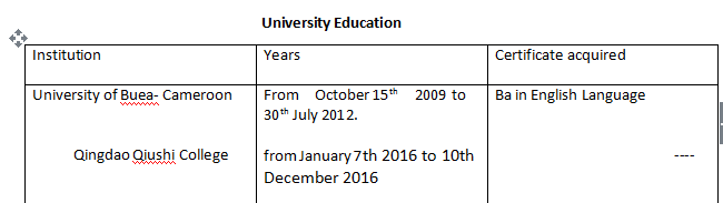 教育背景:2009-2012:英語本科 喀麥隆 2016/1-2016/12 青島求實(shí)大學(xué) 教學(xué)經(jīng)驗(yàn): 政府雙語高中:2013-2015: 英語老師 幼兒園:武漢 2017-2019 英語老師 |