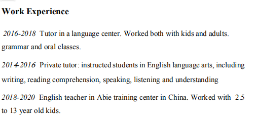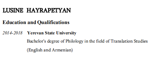 教學(xué)經(jīng)驗(yàn): 2016-2018語言中心教員。 與孩子和成人一起工作。 教授語音,語法和口語課。 2014-2016私人導(dǎo)師:指導(dǎo)學(xué)生學(xué)習(xí)英語語言藝術(shù),包括 寫作,閱讀理解,口語,聽力和理解 2018-2020年在中國阿比培訓(xùn)中心擔(dān)任英語老師。 2.5- 給13歲的孩子 教育背景: 2014-2018埃里溫州立大學(xué) 翻譯研究領(lǐng)域的語言學(xué)學(xué)士學(xué)位 (英語和亞美尼亞語) |