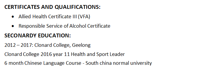 澳大利亞吉朗市 克洛納德學(xué)院本科,有2年左右教學(xué)經(jīng)驗 |