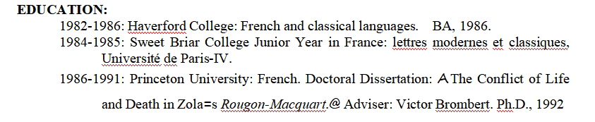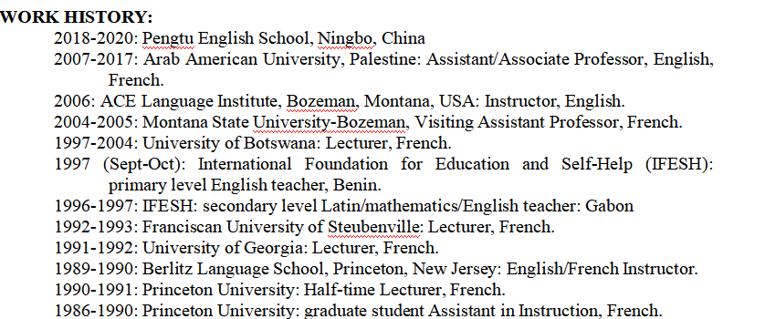教育: 1982年至1986年:哈弗福德學(xué)院:法語和古典語言。文學(xué)士,1986年。 1984年至1985年:法國Sweet Briar大學(xué)初中:巴黎第四大學(xué),現(xiàn)代與經(jīng)典文學(xué)。 1986-1991年:普林斯頓大學(xué):法語。 工作經(jīng)歷: 2018-2020:寧波蓬圖英語學(xué)校 2007年至2017年:巴勒斯坦阿拉伯美國大學(xué):英語/法語助理/副教授 2006年:美國蒙大納州博茲曼市ACE語言學(xué)院:英語講師。 2004年至2005年:蒙大拿州立大學(xué)-博茲曼分校,法語系客座助理教授。 1997年至2004年:博茨瓦納大學(xué):講師,法語。 1997年(9月):國際教育和自助基金會(IFESH):貝寧小學(xué)英語老師。 1996-1997年:IFESH:中學(xué)英語/拉丁語/數(shù)學(xué)/英語教師:加蓬 1992-1993年:Steubenville方濟(jì)會大學(xué):講師,法語。 1991-1992年:佐治亞大學(xué):講師,法語。 1989-1990年:新澤西州普林斯頓貝立茲語言學(xué)校:英語/法語講師。 1990年至1991年:普林斯頓大學(xué):法語半日制講師。 1986年至1990年:普林斯頓大學(xué):研究生教學(xué)助理,法語。 |